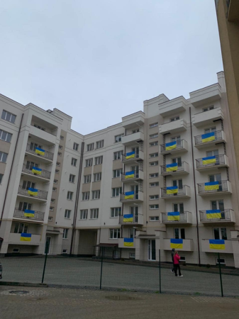 В Ужгороді балкони багатоповерхівки прикрасили державними стягами України (фото)