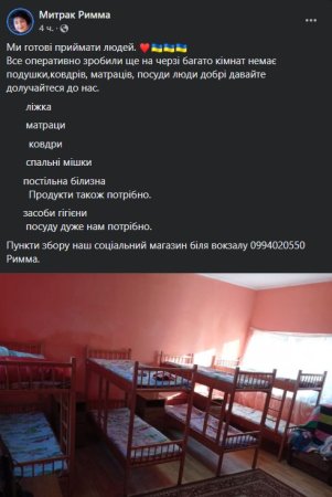 “Ми готові приймати людей. Все оперативно зробили. Ще на черзі багато кімнат. Ще потрібні подушки та матраци, посуд. Люди добрі, долучайтесь”, – пише Римма Митрак.