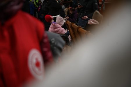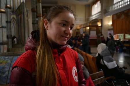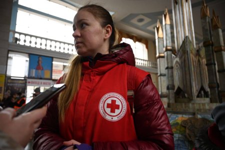 Волонтерка Закарпатської обласної організації Товариства Червоного Хреста України Марія Туряниця координує тимчасово переміщених осіб на залізничному вокзалі в Ужгороді: