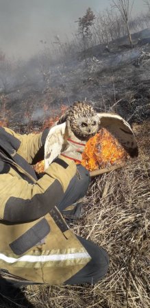 Ось таку красуню-сову🦉 врятували під час пожежі сухої трави ужгородські вогнеборці. Люди, схаменіться! Припиніть нищити довкілля🙏🙏🙏