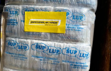 За його словами, такі наліпки вперше прикріпили до гуманітарного вантажу, який надали наші сусіди зі Словаччини.
