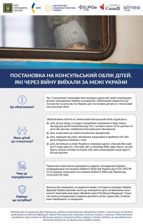 Окремі категорії дітей, які через війну виїхали з України, потребують обов’язкової постановки на консульський облік. З інфографіки можна дізнатися: