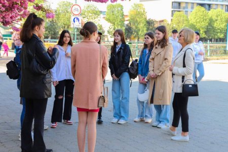 Спочатку через коронавірус, а зараз через війну навчання тривалий час уже проводяться переважно онлайн. Дітям дуже складно, бо вони позбавлені живого спілкування з ровесниками. Сьогодні на урок під сакурами на площі Театральній прийшли гімназисти 8 і 9 класів, серед них – двоє школярок із Харкова, які вже навчалися онлайн з ужгородськими школярами, а нині особисто познайомилися з однокласниками. Також онлайн долучилася й дівчинка, яка зараз тимчасово за кордоном.