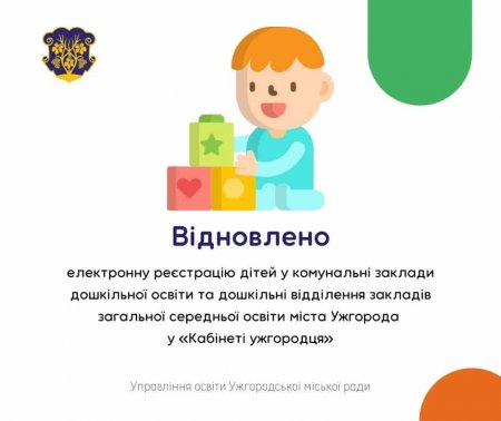 Електронну реєстрацію дітей у комунальні заклади дошкільної освіти та дошкільні відділення закладів загальної середньої освіти міста Ужгорода у «Кабінеті ужгородця» відновлено.