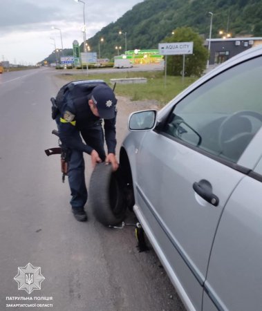 Охоронці порядку зняли колесо та відвезли на станцію технічного обслуговування. А повернувшись до громадян, допомогли поставити його на місце.