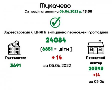 У місті зареєстрували 24084 громадян, які були змушені покинути свої домівки, з них 6851 – діти. Понад 20 тисяч переселенців живуть в приватному секторі громади, ще близько 4 тисяч людей – у міських гуртожитках. За минулу добу у Мукачеві зареєструвалися ще 14 вимушених переселенців.