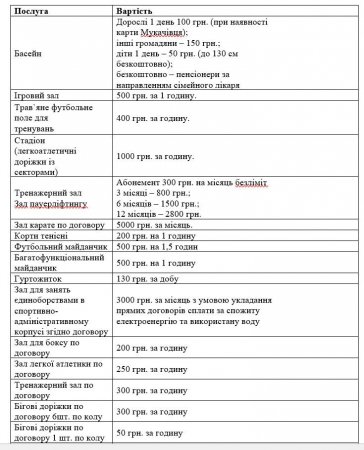 З метою залучення більшої кількості населення та створення сприятливих умов для занять фізичною культурою й спортом у спортивній школі Мукачева розширили перелік платних послуг. Нещодавно для мукачівців та гостей міста відкрили басейни ДЮСШ. Для учнів спортивної школи басейни безкоштовні, за направленням сімейного лікаря відвідування безоплатне і для пенсіонерів, вартість входу за день для дорослих відвідувачів 150 гривень, з картою мукачівця – 100 гривень, для дітей – 50 гривень, малеча ростом до 130 сантиметрів зможе відвідувати басейни безкоштовно. Вартість досі наявних послуг не змінилася.