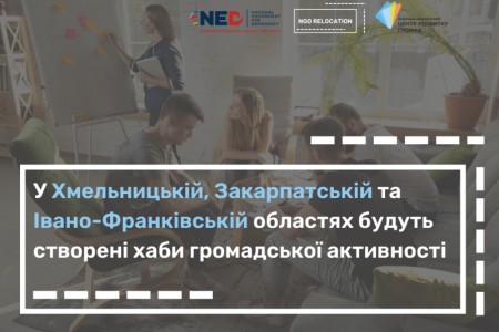 Створення та облаштування відбуватиметься в рамках проєкту «NGO relocation». Організатори отримали 33 заявки із семи областей України. За результатами конкурсу у Закарпатській, Хмельницькій та Івано-Франківській областях громадські організації-переможці отримають підтримку у створенні та облаштуванні хабів громадської активності в обласних центрах, які в подальшому працюватимуть з релокованими громадськими організаціями. У хабі працюватиме координатор, який сприятиме ефективній реалізації активностей проєкту, виявлятиме потреби громадських активістів та надаватиме пропозиції щодо їх задоволення. Проєкт діятиме протягом 12-ти місяців, в рамках якого регулярно проводитимуться освітні та інтеграційні заходи для релокованих громадських організацій.