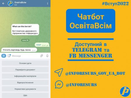 Відтепер основні дати вступної кампанії для обраної траєкторії вступу, контакти служби підтримки чи відеоінструкції з реєстрації електронних кабінетів можна знайти у чат-боті «ОсвітаВсім», який створив ДП «Інфоресурс». Бот доступний у месенджері телеграму та прив'язаний до фейсбук-сторінки ДП «Інфоресурс».