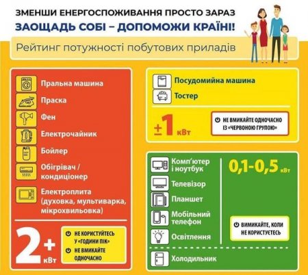 1️⃣ обмежте у пікові ранкові та вечірні години використання електроприладів з «червоної групи»;
