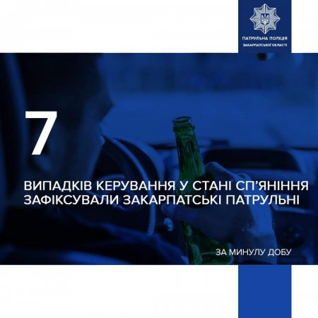 7 випадків керування у стані сп’яніння зафіксували закарпатські патрульні за минулу добу: 5 із них інспектори виявили в Ужгороді і 2 — в Мукачеві.