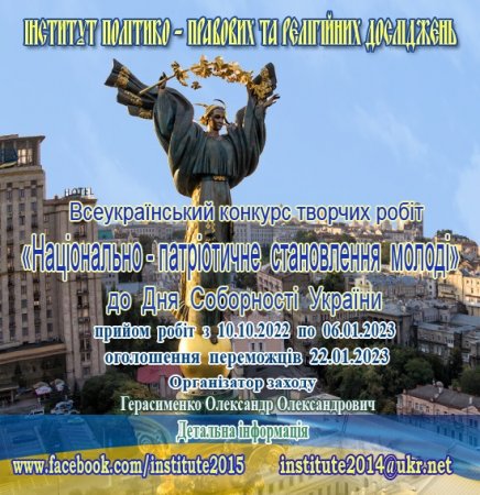 В прес-службі Закарпатської ОВА повідомляють про те що, Інститут політико-правових та релігійних досліджень з нагоди відзначення Дня Соборності України проводить Всеукраїнський конкурс творчих робіт «Національно-патріотичне становлення молоді».