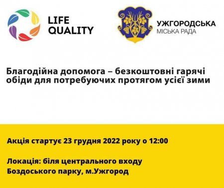 Громадська організація «Фонд «Якість Життя» разом із Ужгородською міською радою та аварійно-рятувальним загоном спеціального призначення ГУ ДСНС у Закарпатській області розпочинають благодійну акцію – гарячі обіди для потребуючих протягом усієї зими, попередньо – щоп’ятниці.