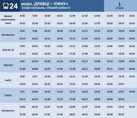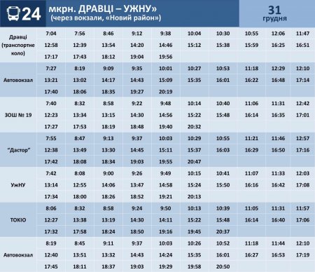КП "Ужгородський муніципальний транспорт" надає інформацію про графіки руху автобусів на міських маршрутах №№18, 20 та 24 на 31 грудня та 1 січня.