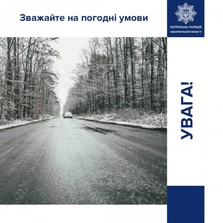 Сьогодні вдень на всій території Закарпатської області очікується сніг, який йтиме до самого вечора, можлива ожеледиця. Будьте уважними та обережними на дорогах! Дотримуйтесь правил дорожнього руху, зокрема, безпечної швидкості та інтервалу!