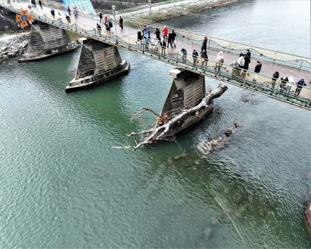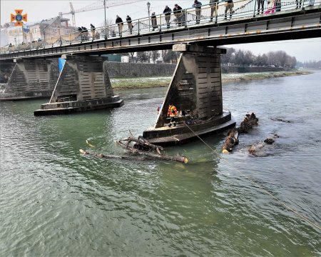Сьогодні в Ужгороді рятувальники Аварійно-рятувального загону спеціального призначення проводили розчистку опор пішохідного мосту від сміття та деревини, які нанесло водою під час нещодавньої негоди.