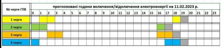 Прогнозовані години включення/відключення електроенергії на суботу, 11 лютого