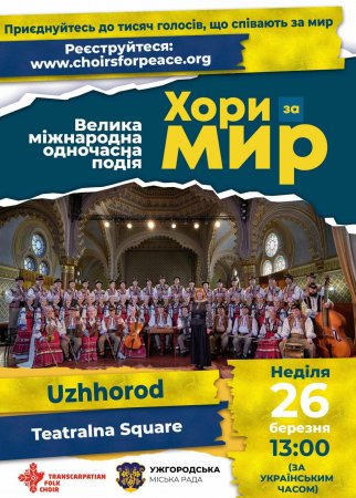 Заслужений академічний Закарпатський народний хор візьме участь у міжнародному хоровому флешмобі «Хори за мир» («Choirs for Peace») – подія відбудеться у неділю, 26 березня, на площі Театральній в Ужгороді. Молитимуться за мир 27 хорів – 20 із Закарпаття та 7 із інших регіонів України – Одеси, Чернігова, Львова.