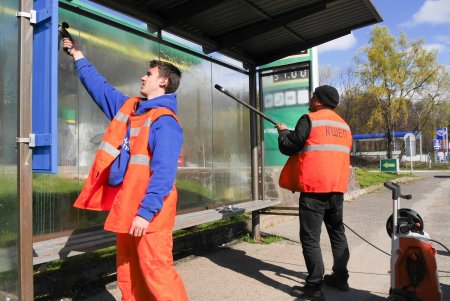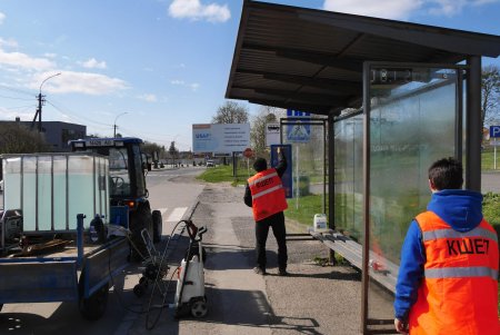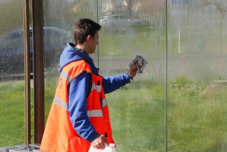 Використовують спеціальні мийні засоби, розчинники, миють не тільки скляну поверхню, а й стелі, якщо сидіння на лавицях поламані – ремонтують, приміром, біля автовокзалу повністю замінили сидіння на лавках, знімають також спецзасобами іржу із металевих частин зупинок, фарбують – де є така потреба.