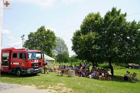 Далі мова йшла про небезпечні ігри під час відпочинку біля води та дії у разі виявлення вибухонебезпечних предметів. Фахівці-піротехніки за допомогою 3D cтендів продемонстрували основні різновиди боєприпасів та розповіли, як необхідно поводитися під час їхнього виявлення. А для того, аби позитивні емоції закріпили такі необхідні знання, дітям показали як подавати воду від пожежного авто та ознайомили з пожежно-технічним обладнанням.