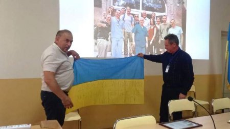 Подяку від військової частини А4219 та прапор із підписом від 128-ї гірсько-штурмової бригади з рук у руки колективу лікарні у особі керівника Юрія Яцини передав заступник голови Закарпатської обласної ради Василь Дем’янчук.