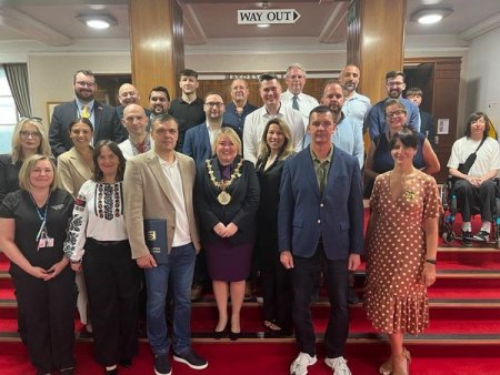 Планується також підписання договору про співробництво із містом Манчестер. Про це йшлося під час зустрічі у мерії із керівництвом міста та волонтерами. Депутати облради переказали слова вдячності від українців англійським благодійникам та вручили їм відзнаки. Окремо представники облради подякували волонтерам - Оксані та Олександру Непийвода (які родом із Ужгорода, та живуть понад 10 років в Британії), що організували та відправили найбільшу кількість гуманітарного вантажу для українців.