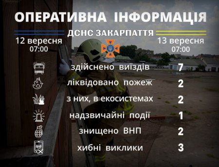 Підрозділами Головного управління ДСНС України у Закарпатській області впродовж чергової доби для оперативного реагування на події та ліквідації їх наслідків, гасіння пожеж, проведення інших рятувальних заходів здійснено 𝟕 виїздів, з яких три – хибні.