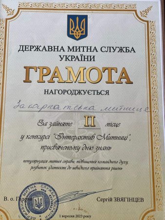 Відтак, за результатами інтерактивну було визначено переможців та підведено підсумки. Команда Закарпатської митниці посіла у конкурсі друге місце та відзначена Грамотою Держмитслужби від в.о. Голови Сергія Звягінцева.