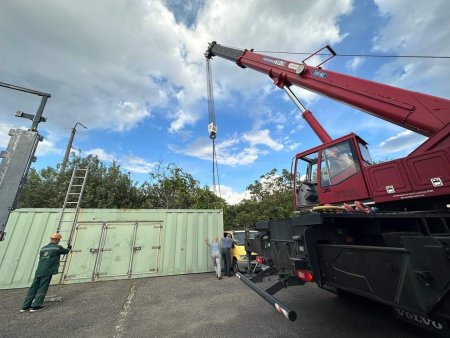 Потужний генератор привезли каміоном і розвантажували краном. Він важить понад 10 тон і може забезпечити електронергією невеличкий населений пункт або комплекс із кількох багатоповерхівок.