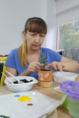 Як розповідає Юлія Дуб, захід покликаний покращити емоційний стан людей, що опинилися далеко від рідних домівок, додати затишку, створити сприятливе середовище для спілкування, відпочинку. Тож разом із дітьми та дорослими розмальовували фарбами глиняні горщики, саджали рослини, які потім учасники можуть забрати із собою.
