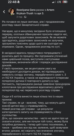 Про те, що на останньому засіданні сторона захисту вимагала перерву, аби долучили додаткових захисників і, звісно, не зробила цього йдеться у дописі на Роксоляни Гери, захисниці потерпілої у мережі: