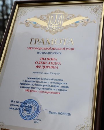 Сьогодні сторічний ювілей святкує жителька Ужгорода Олександра Іванова. Привітав ювілярку в.о. міського голови, заступник міського голови Вадим Борець.