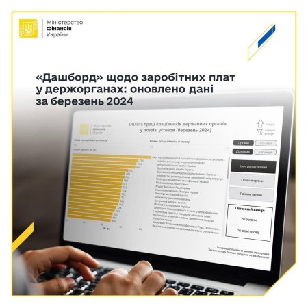 На основі отриманих даних від державних органів за березень 2024 року Мінфін оновив аналітичний інструмент (дашборд) щодо оплати праці та чисельності працівників державних органів, місцевих держадміністрацій і органів судової влади.