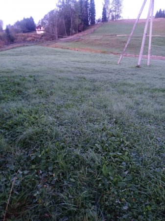 На фото можна побачити, що температура повітря вранці у селі Верхній Яловець – мінус 3 градуси, земля покрилася інеєм.