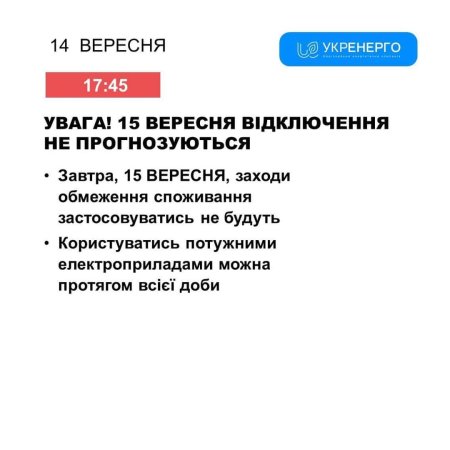 💡На завтра відключення світла не прогнозуються, - Укренерго