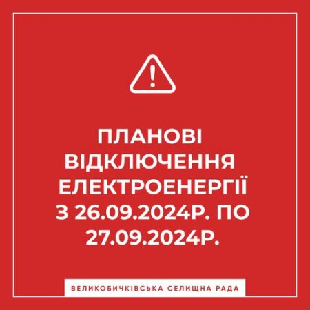 За інформацією ПрАТ "Закарпаттяобленерго" з 26.09.2024р. по 27.09.2024р. на території Великобичківської громади триватимуть можливі планові відключення енергопостачання за таким графіком: