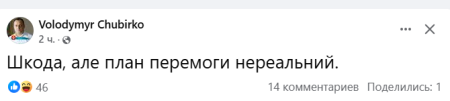 Екс-голова Закарпатської обласної ради, Володимир Чубірко, в соціальній мережі Фейсбук висловив свою думку щодо плану перемоги у війні в Україні. Він зазначив, що, на його думку, існуючий план не є реалістичним. Чубірко, як колишній голова Закарпатської облради її депутат та представник органів місцевого самоврядування, має особливу точку зору на внутрішні проблеми, які, на його переконання, стоять на заваді реалізації подібних планів.