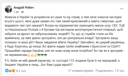 P.S. Якби не мій дикий характер, то сьогодні 172 людини були б на передовій, а бюджет України в пизд….Бог Вам суддя мразі!!!