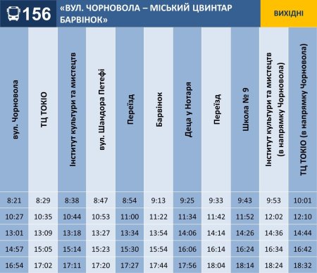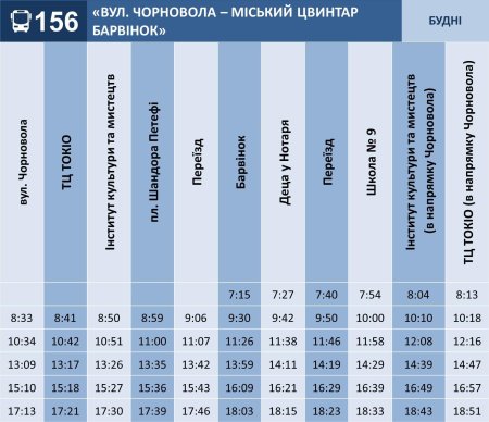 Курсуватиме і маршрут №156 «вул. В’ячеслава Чорновола-міський цвинтар «Барвінок» (розклад руху – на фото).
