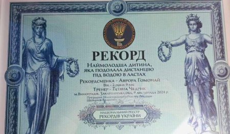 Маленька Аврора Гомонай, вихованка школи раннього плавання «Здорова дитина» під керівництвом тренера Чедрик Тетяни Петрівни та засновниці школи, у віці 2 років подолала дистанцію під водою у ластах у 20,25 метрів за 28 секунд.