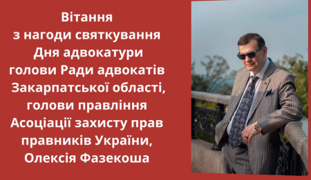 Вітання з нагоди святкування Дня адвокатури голови Ради адвокатів Закарпатської області, голови правління Асоціації захисту прав правників України, Олексія Фазекоша.