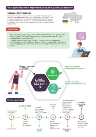 👉 Пропозиції можуть бути подані в електронній системі проведення конкурсу з дня опублікування оголошення до 23:00 24 січня 2025 року: http://grants.vzaemo.diia.gov.ua/.