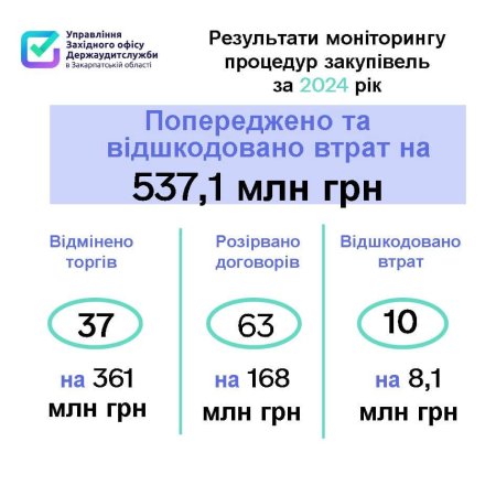 ✅ Порушенням на понад 529 млн грн вдалося запобігти. За результатами моніторингів, які зробили спеціалісти Управління, замовники скасували 37 процедур торгів на загальну суму 361 млн грн та розірвали 63 договори на понад 168 млн грн. Відшкодовано незаконних витрат та втрат, проведених із порушенням законодавства, – на майже 8,1 млн грн.