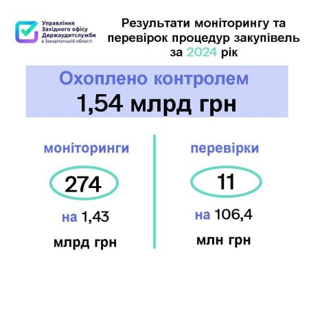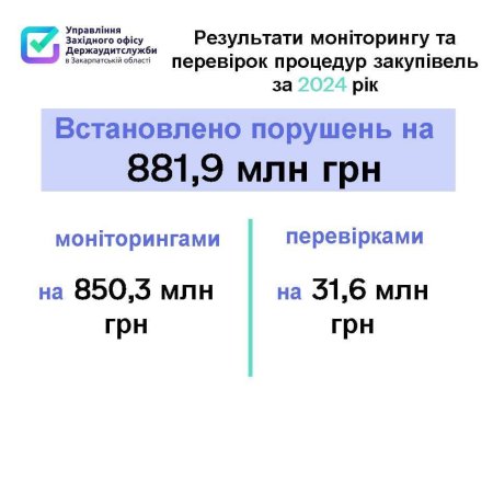 На понад 872,1 млн грн порушень законодавства під час 274 моніторингів закупівель та 11 перевірок закупівель виявили протягом 2024 року працівники Управління Західного офісу Держаудитслужби в Закарпатській області. Ще на 9,8 млн грн аудитори виявили порушень законодавства, які призвели до фінансових та матеріальних втрат.