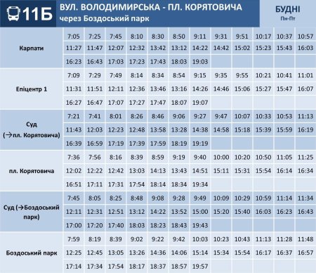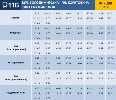 Новий автобусний маршрут № 11Б «вул. Володимирська – пл. Корятовича (через Боздоський парк)» буде обслуговувати Комунальне Підприємство "Ужгородський муніципальний транспорт" , для чого використовуватиме три автобуси, які пристосовані для перевезення осіб з інвалідністю та інших
