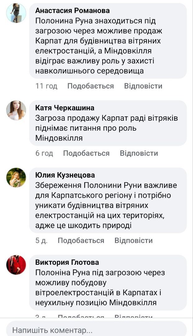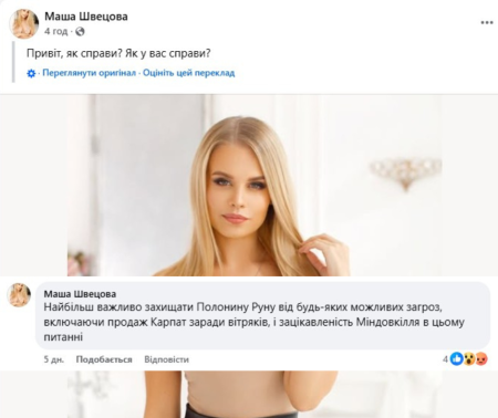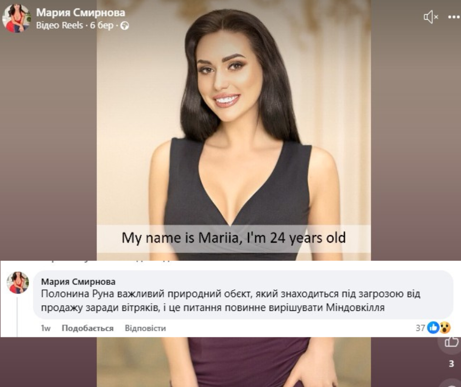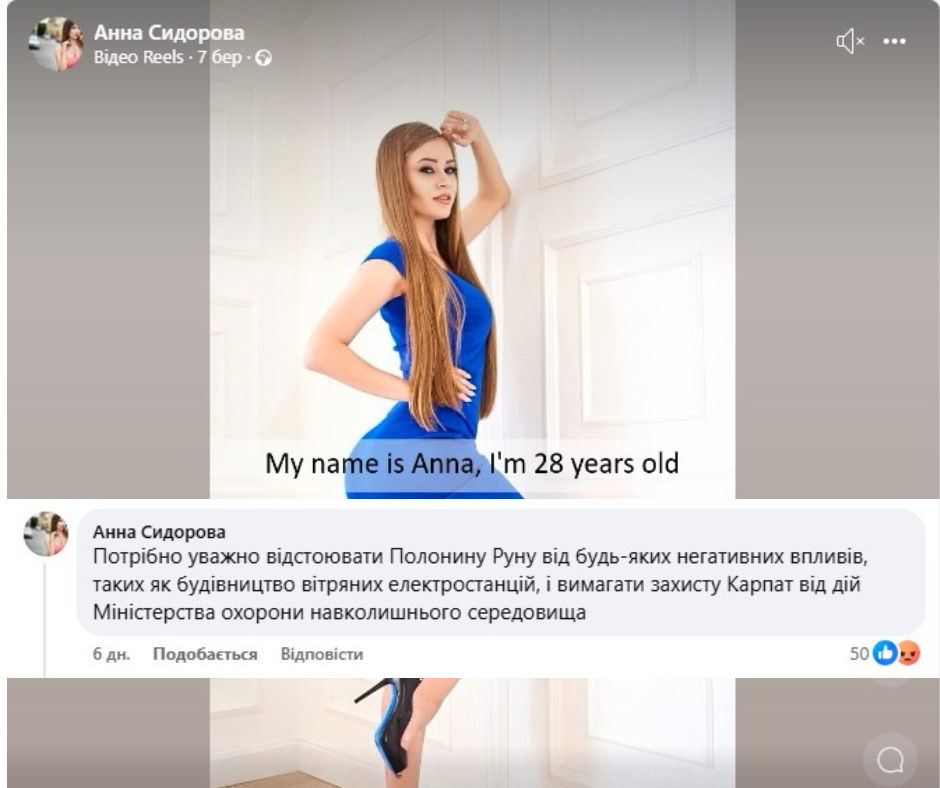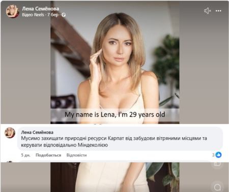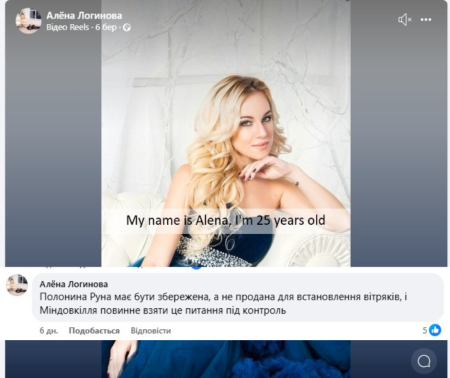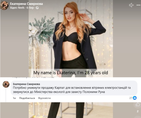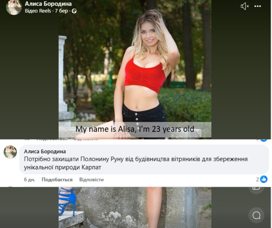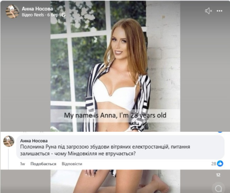 Марія Смирнова в коментарях критикує будівництво вітряків, але на своїй сторінці пропонує «знайти швидке знайомство». Аліса Бородіна під постами вимагає «збереження Карпат», але на своїй сторінці запрошує на сайт, де «чекають самотні дівчата». Анна Носова : закликає «зупинити продаж гір», але її власний профіль рясніє фото в білизні з підозрілими посиланнями. Загалом ми нарахували близько 30-40 таких коментаторів...