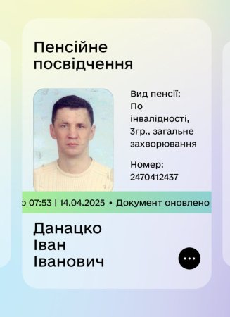 Згідно з електронним пенсійним посвідченням, Іван Данацко отримує пенсію по інвалідності 3-ї групи через загальне захворювання. Проте медична комісія військкомату (ВЛК) визнала його обмежено придатним до військової служби, що дало підстави для мобілізації.