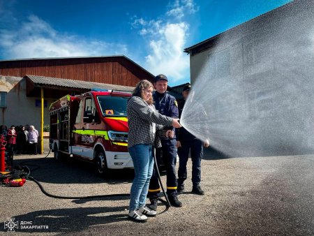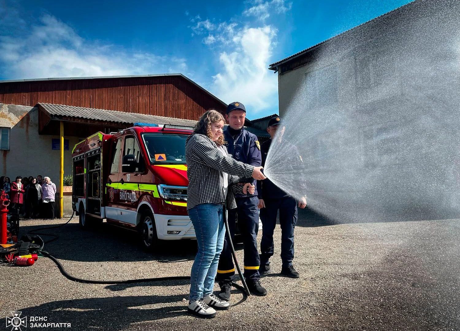 Родзинкою стала практична частина заходу: молодь оглянула пожежну техніку, дізналася про оснащення пожежного автомобіля та навіть спробувала себе у ролі рятувальників. У бойовому спорядженні студенти брали участь у гасінні умовної пожежі, користувалися вогнегасниками та пожежним рукавом.