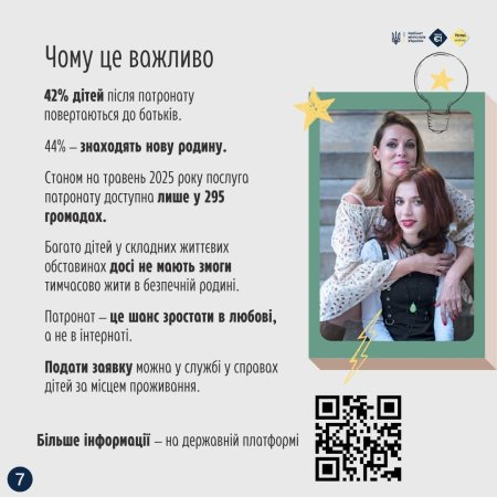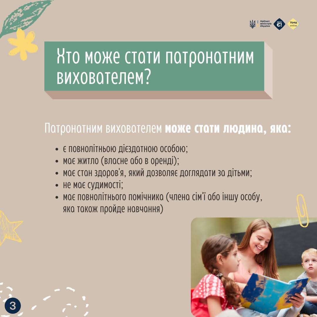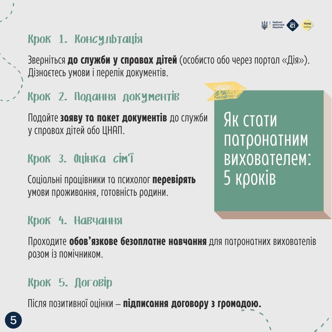Якщо ви відчуваєте в собі сили та бажання допомогти дитині, яка опинилася в скрутних обставинах, і бажаєте дізнатися більше про патронат, зверніть увагу на інформацію в інфографіці, що надається нижче. Вона детально пояснює вимоги до патронатних вихователів та покроковий процес оформлення патронату.