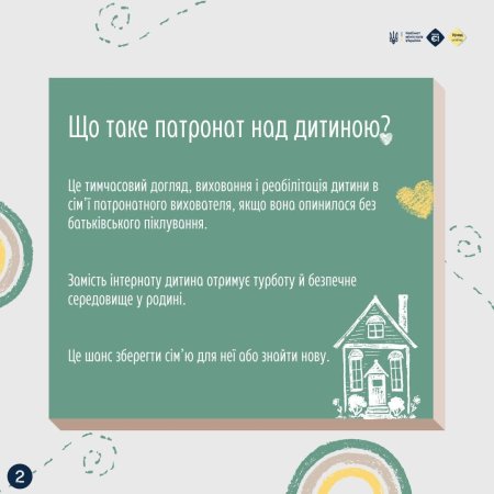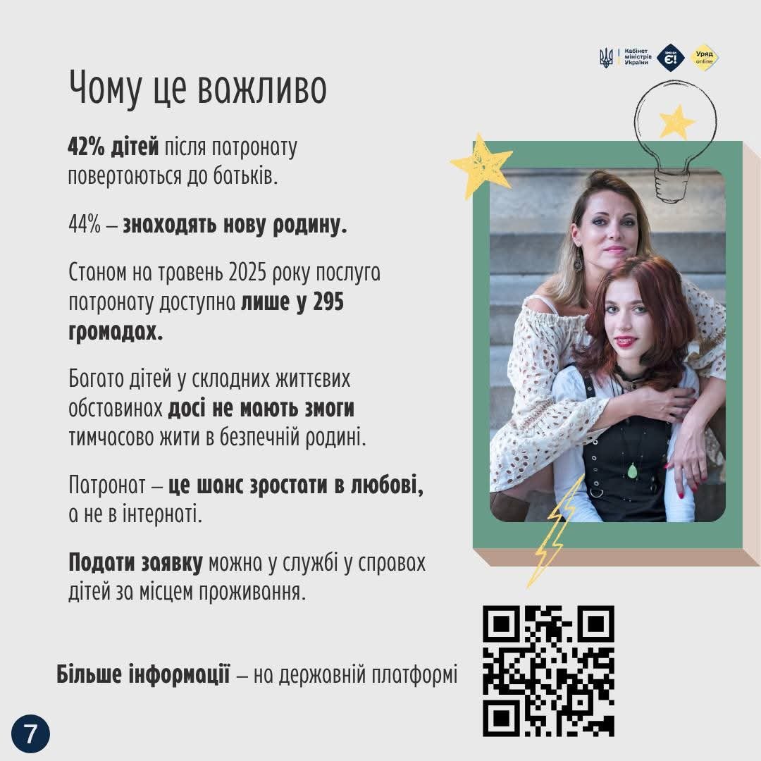 Коли дитина залишається без батьківського піклування, їй потрібна не лише турбота, а й безпечне та стабільне середовище. Саме для таких випадків в Україні існує патронат над дитиною – це тимчасовий догляд та виховання дитини в родині патронатного вихователя. Це гуманна альтернатива інтернату, яка дає змогу дитині зростати в сімейному затишку.
